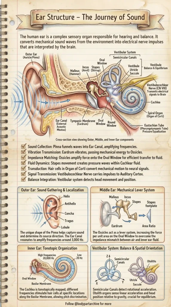If you look closely at the “Sound Gathering & Localization” panel, you’ll see the pinna is not just a random flap of skin. Its unique ridges and folds—including the Helix, Antihelix, Concha, and Tragus—are precisely shaped to capture sound waves and determine their directional source.